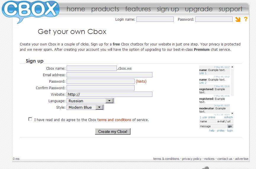 http://www.cbox.ws/getone.php - заповнюємо представлену реєстраційну форму.